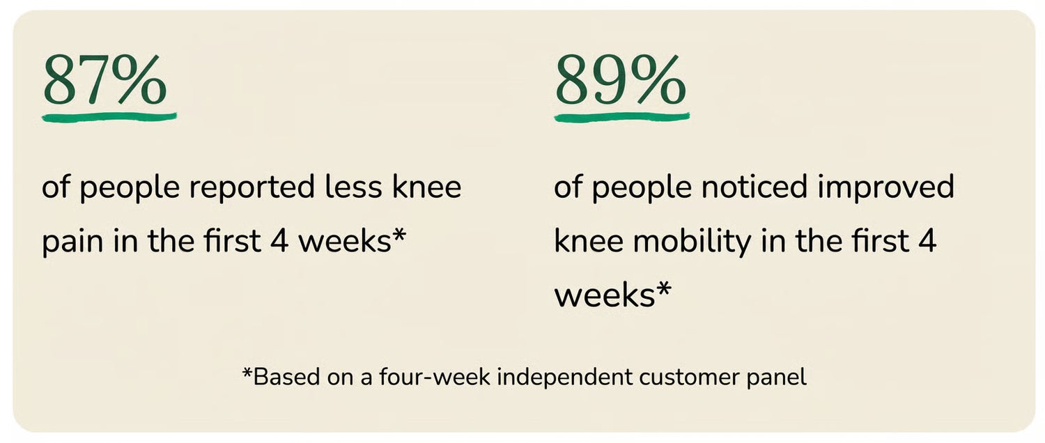 You’re covered by our 30-day money-back guarantee. No return shipping. No restocking fee. No 47-question survey. If you don’t feel a real, noticeable difference in your joints, email us and we refund every penny. We can make this promise because the vast majority of customers reorder. We’re that confident.