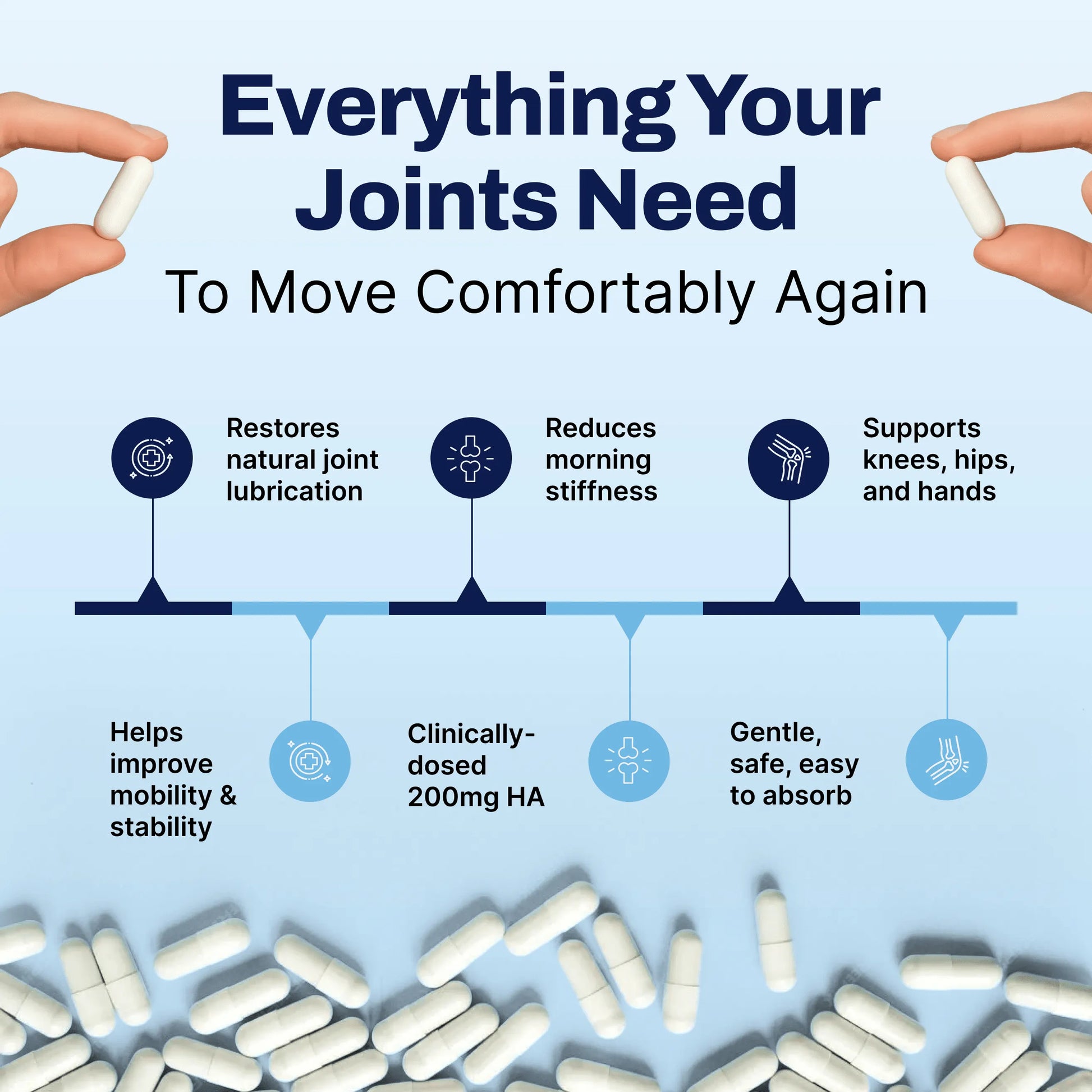 Hyaluronic acid forms the lubricating fluid that keeps joints smooth and shock-absorbed. After 40, levels decline. By 60, joints can feel nearly dry. Replenishing HA helps restore glide instead of grind.